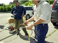 小生の試行錯誤の結果の話などはもどかしくて、 話し半ばで各人立ち木を相手に材料の軟化(小生これを「だまし」と表言)―曲げ作業にかかり、 小生の用意した物差しなど見向きもしないで、大小・形態様々なそれぞれ自分だけのオリジナルな原型を1~2足作り上げた。 中には子供の分まで作り上げる「だまし」上手な手際の良い人もいた。