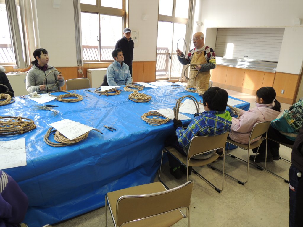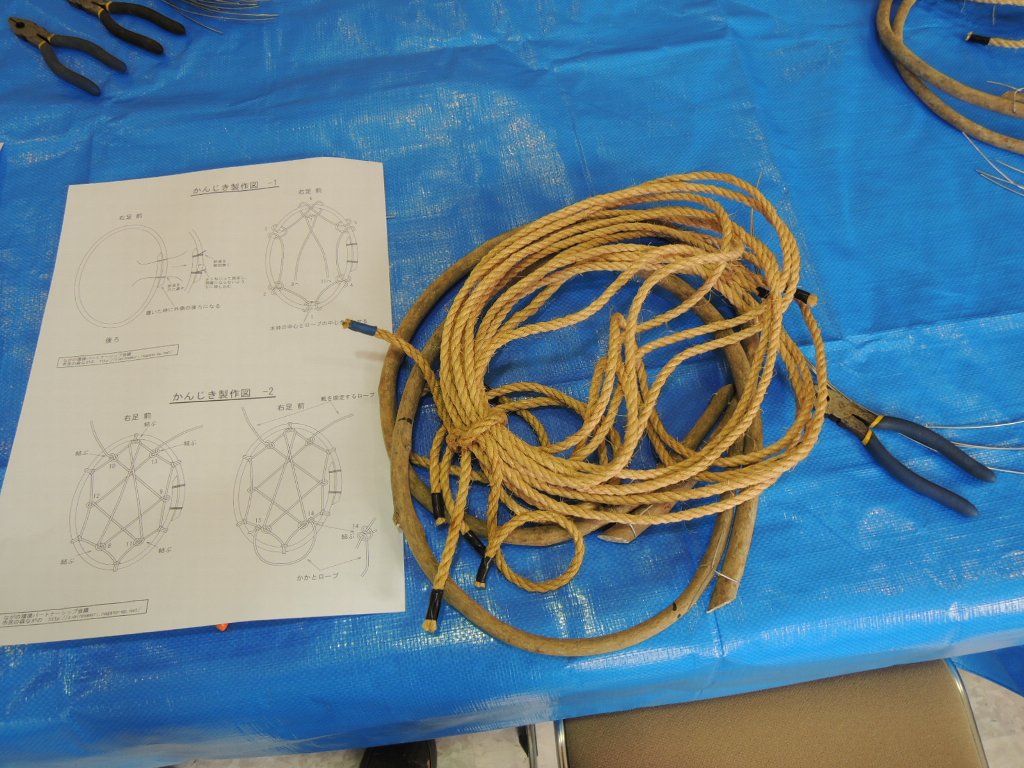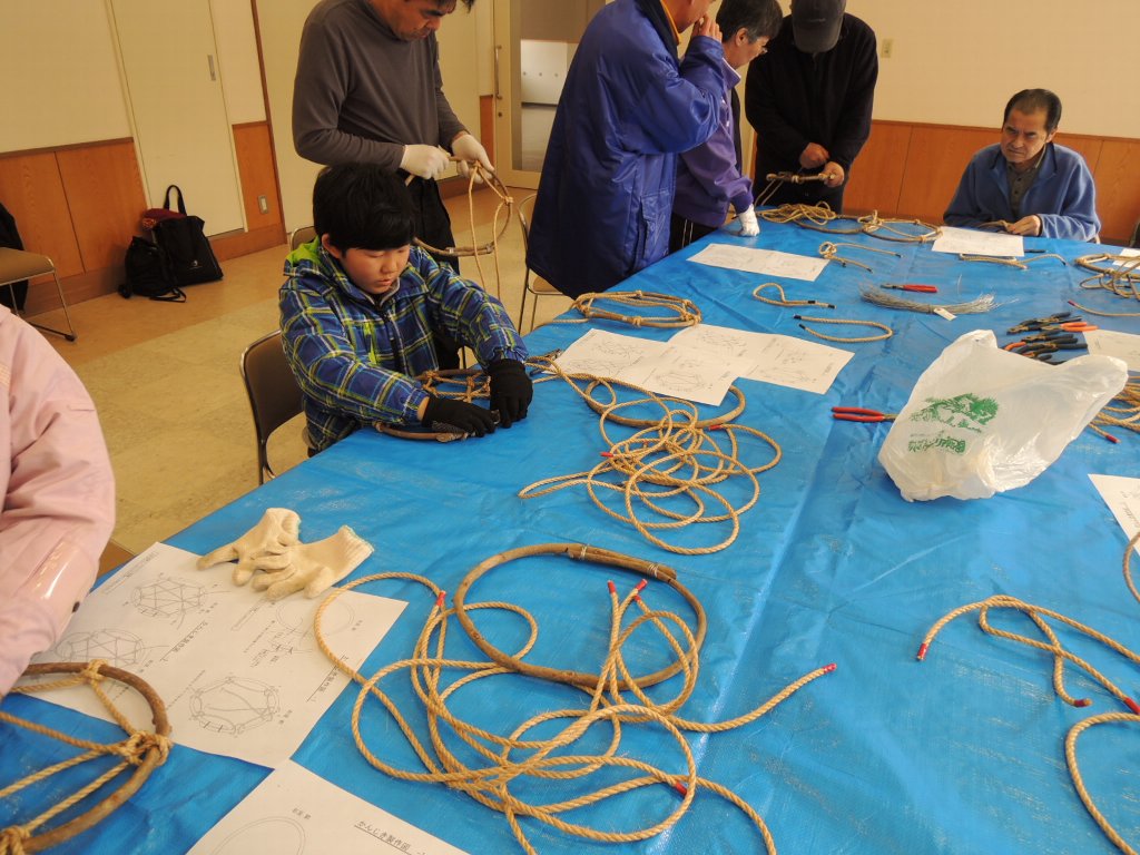 「かんじき」作りでは、リョウブの枝を輪にしたものを針金で固定してから、ロープを結んでいくのですが、これがパズルのようなので初めは戸惑いますが、だんだん夢中になっていきます。