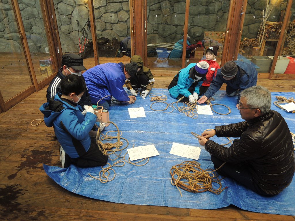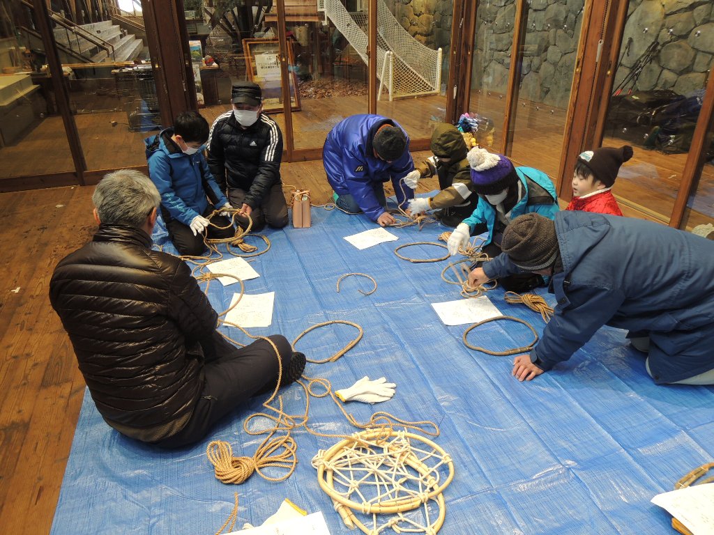 針金で固定するところは、事前に済ませていたのでロープを編むところだけやってもらったのですが、時間的にはちょうどよかったようで雪の上をかんじきで歩くのも含めてちょうど2時間くらいで終了しました。
