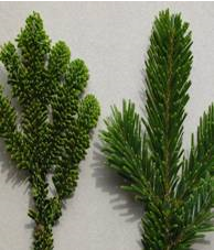 更に、全体の葉の着き方が写真12のように右側のコメツガは葉のサイズが揃って整然と並ぶにの対して左のツガはコメツガより大き目で葉のサイズにバラツキが大きい事です。