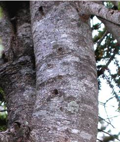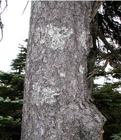コメツガとウラジロモミとトウヒの樹皮は写真13のように割れてザラザラになっていますが、シラビソとオオシラビソは写真14のように平滑で所々に脂袋がプクッとふくれています。