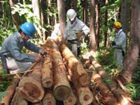 活動を続ける中で、D地区の30数余年たつたスギの間伐を進める間に、 直径30センチからのスギをみてメンバーから間伐した丸太を森にそのまま玉切りしておいては「勿体無い」せっかくここまで育ったのに、 何とか利用出来ないだろうかの声が湧き上がって来ました。