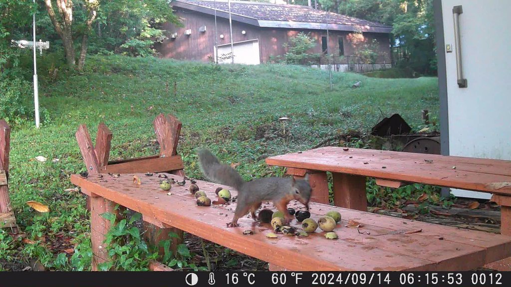 ベンチの上にヒメグルミの実を並べておいたら、リスがヒメグルミの実を食べる様子が撮れるだろうと思い、センサーカメラを設置してみました。
