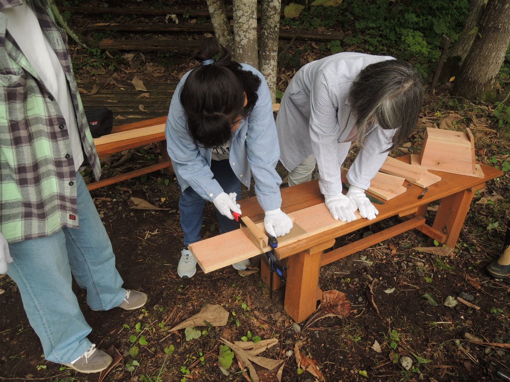 のこぎり、かなづち等の道具をうまく使えるのか心配していたのですが、少し手伝ってあげれば、なんとかなる。ドリルで3cmの穴をあけることもできたし、バーナーを使って、巣箱の表面に焦げ目をつけることも出来てしまった。