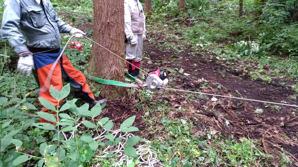 第3回目では、「かかり木」の作業が出来なかったため、今回は「かかり木」になるように伐木し、何本か「かかり木」にすることができ、「かかり木」の処理を実習することが出来ました。