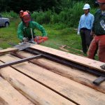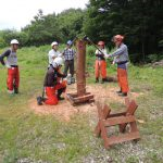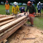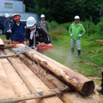 製材作業では、丸太を角材にする作業を各グループ1本ずつ行い、チェーンソーを使用した簡易製材では、丸太を厚さ5cmくらいの板材にする作業を受講者全員が行いました。