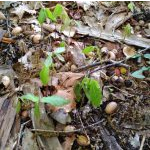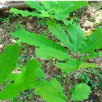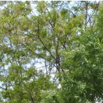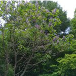 手裏剣のような白い花のヤマボウシ、薄紫色で円錐状のキリの花、白い花がたくさんにぎやかについているニセアカシア、30~40cmもある大きな葉のホオノキ、林の中は明るい緑色になってきて気持よいです。
