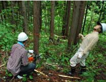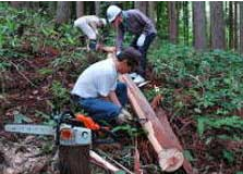 今回は一番古い杉林である、D地区の間伐を行いました。 昨年、一昨年と整備してきたところですが、まだまだ間伐が必要です。 今回から伐採した杉はすべて4mに玉切りし、その場で皮をむいて、貯木することになりました。 将来ログハウス作りの材にするためです。また、自由広場横のB地区も手入れし、歩きやすくなりました。