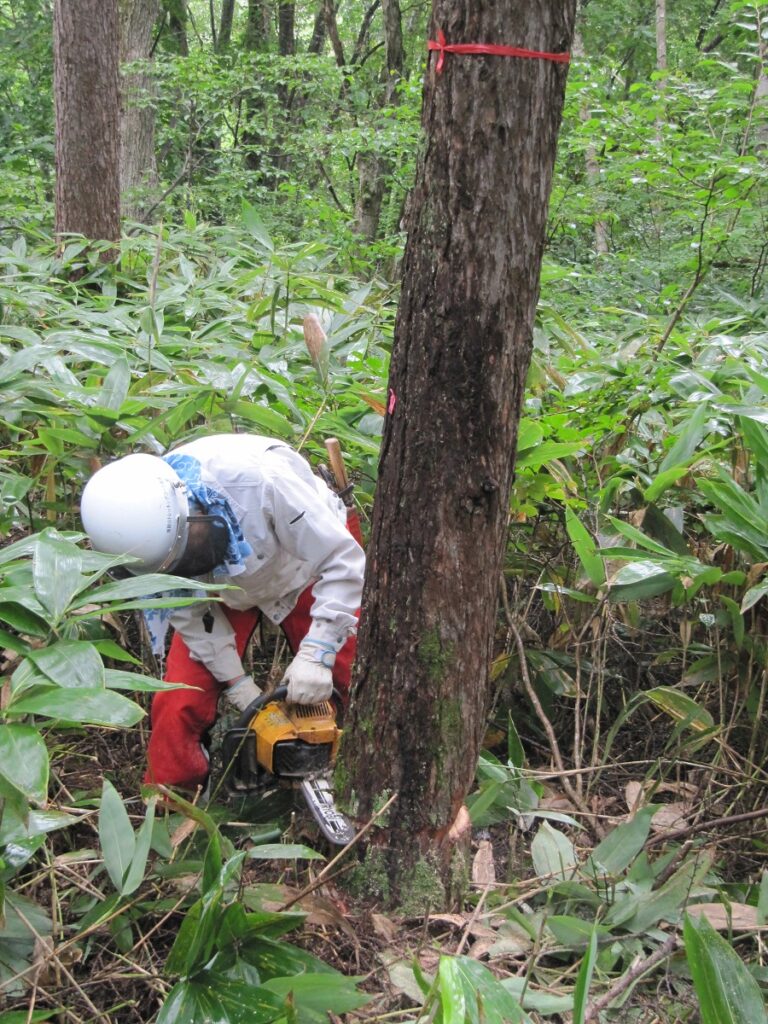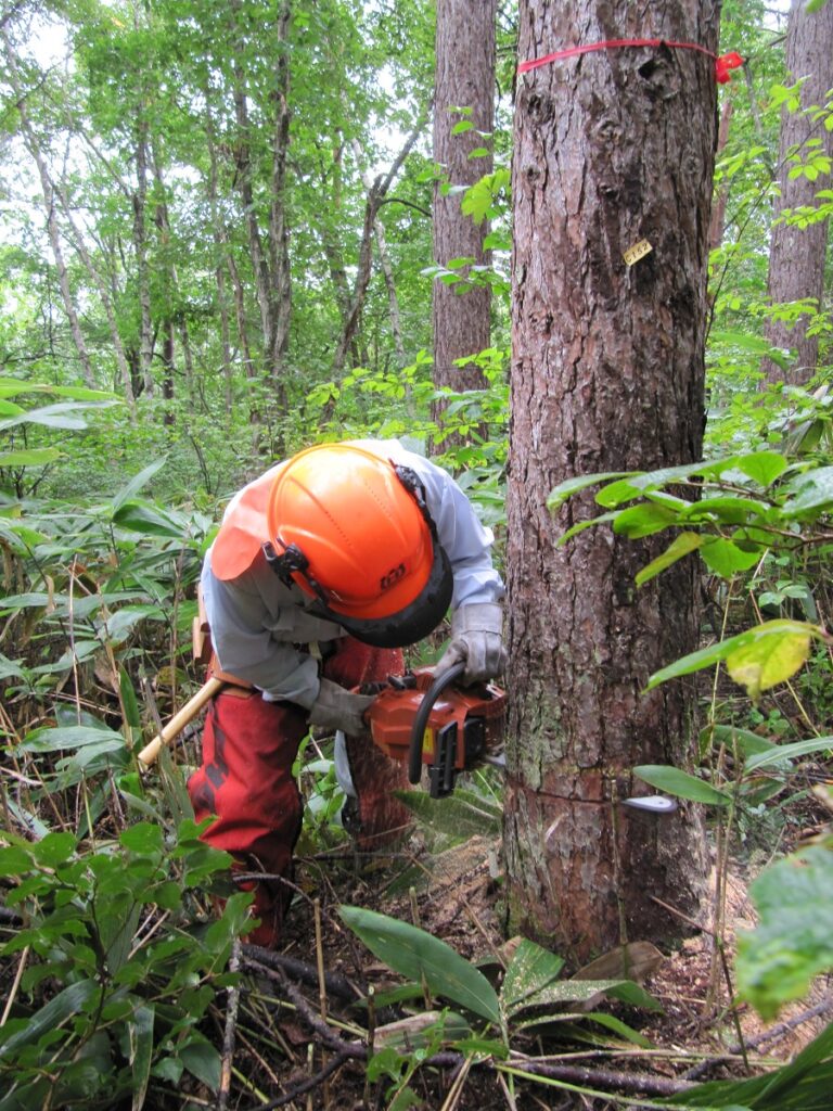 2班では、9本くらい伐ったようですが前半はかかり木なしで順調だったのですが、後半でかかり木になったようです。最後の1本は、広葉樹の二股の間に挟まれる状態のかかり木になってしまいましたが、無事に脱出できました。