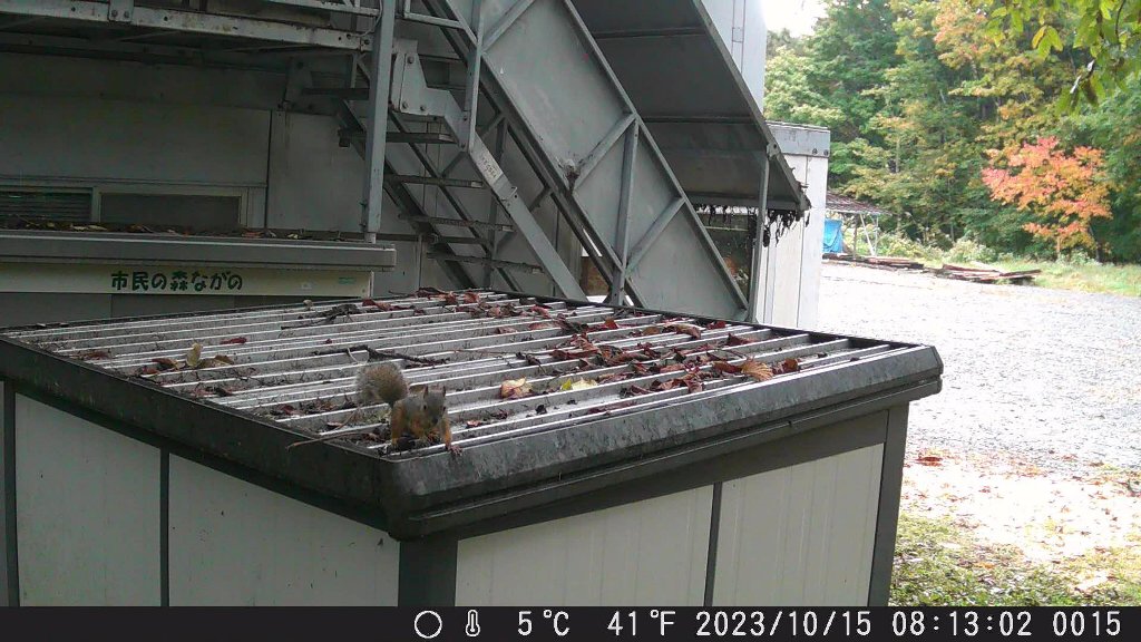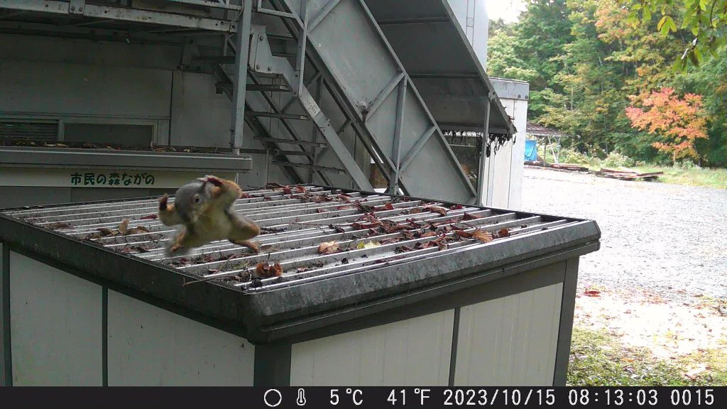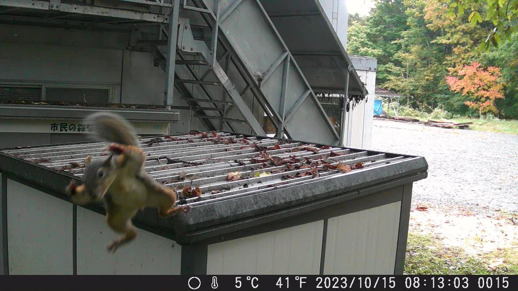 映っていた映像を見てビックリ、倉庫の上からカメラに向かって飛んでくるリスが映っていました。