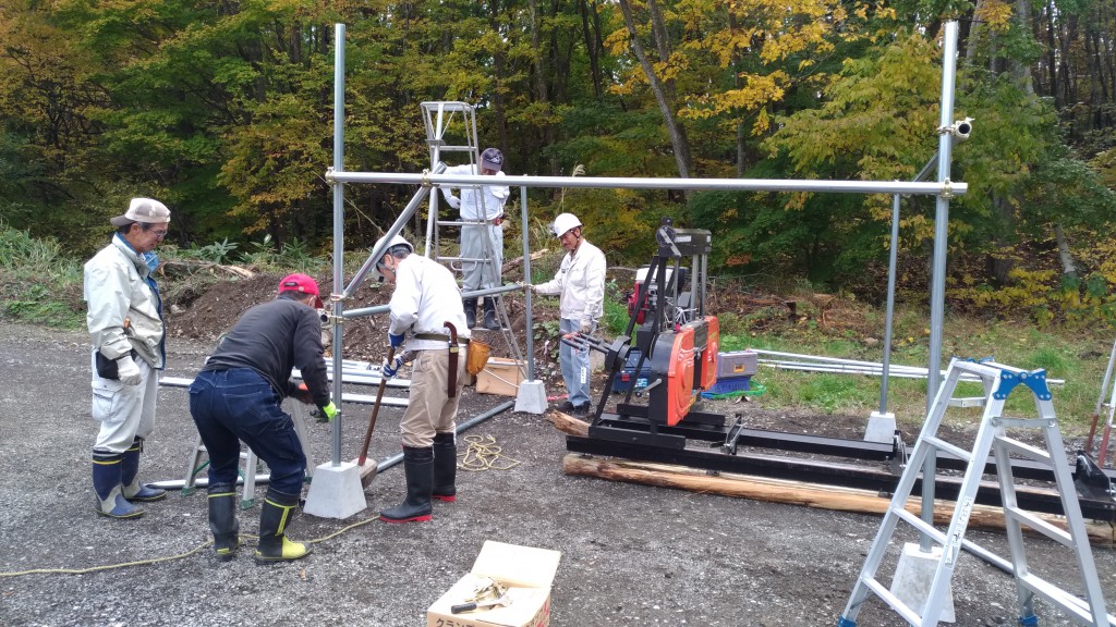 7.製材機を軽トラからレールに降ろす際は、まず軽トラをバックでレールの端につけてから、チェーンブロック用の三脚を軽トラの荷台にかぶせるように設置する。