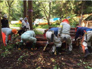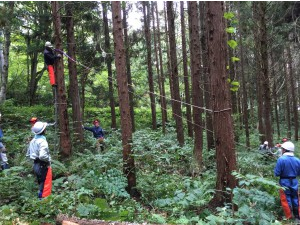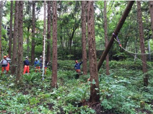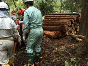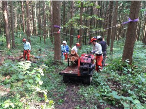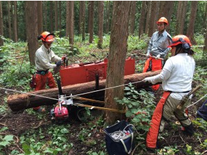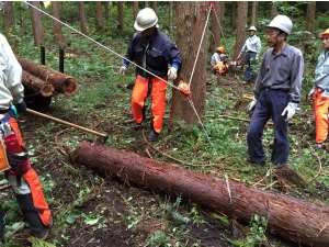 今回は、間伐実習、間伐材搬出実習です。 間伐実習は、木の傾きとは逆方向に倒さなくてはならないとか、近くに電線があり、 電線側には絶対倒すわけにはいかない場合を想定して、ローププラーと滑車で牽引しながら伐倒しました。 倒したい方向に確実に倒します。 間伐材搬出実習は、「ひっぱりだこ」(簡易集材機)、林内作業車を使って行う予定だったのですが、 最初の1本を引っ張ったところで「ひっぱりだこ」が故障してしまい、 林内作業車のみでの作業となってしまいました。林内作業車に間伐材をのせる際はロープウインチで吊り上げたので人力で行う作業が少なくて筋肉痛にならずにすみましたが、実習としては、人力で間伐材を運ぶことも経験しておいたほうがよかったかもしれませんね。