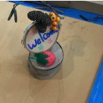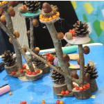 木の枝、ドングリ、松ぼっくり、竹を板状にしたものなどを材料にクルーガンやボンドで接着したり、ポスカで色を塗ったりしました。
