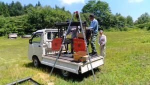 2019/08/03 計量棟に保管していた簡易製材機を広場に運搬しました。 計量棟内から車の荷台に移動、車の荷台からレールの上に下ろす時にチェーンブロックを使用することにより大型機械を使わずに移動することが出来ました。