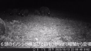 2023/10/13 暗闇の中から6頭のイノシシが横並びであらわれました。迫力ありますね。人がいない時でよかった。 イノシシの動画