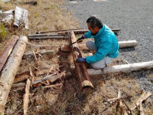 2023/10/29 広場に放置されているスギ丸太の皮むきを行いました。