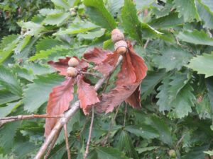 2024/09/08ミズナラの枝の先端部分だけ枯れたようになっているところがありました。これはハイイロチョッキリが切り落とすことが出来なかった枝なのかな。